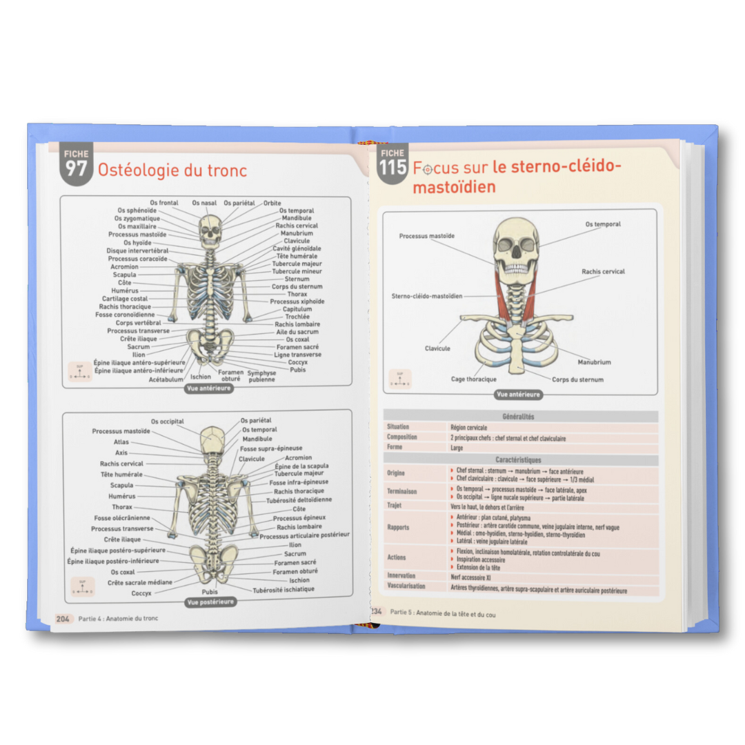 Cet ouvrage, comprenant plus de 300 schémas anatomiques clairs et pédagogiques, accompagnés de nombreux conseils de révision, est une introduction idéale pour établir des fondations solides avant de poursuivre avec nos Fiches et notre Plateforme. Il est composé de 120 fiches illustrées et didactiques, présentées sous forme de cartes mentales et organisées autour de 2 grands axes :